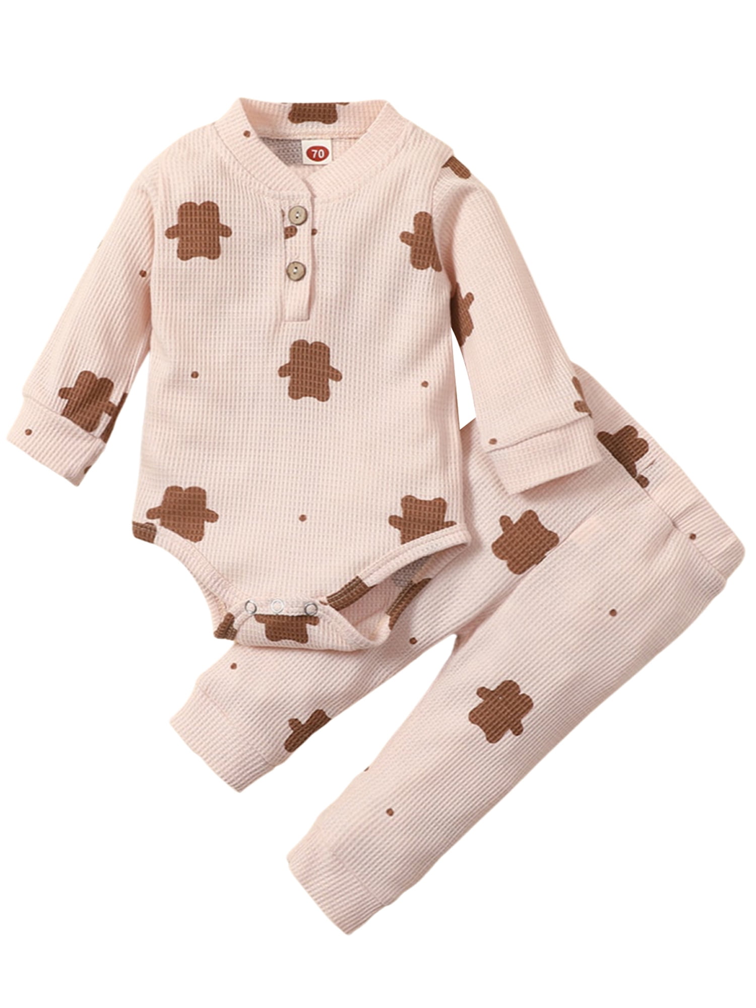 Nokpsedcb 2pcs Infant Boy Girl Bear Print Long Sleeve Round Neck Waffle Outfits Trousers Beige 12 18 Months Walmart Com